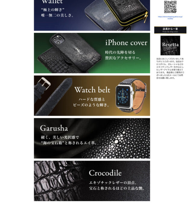 クロコダイルレザーやエイ革などのエキゾチックレザーを使用した革製品を販売されている店舗様です。