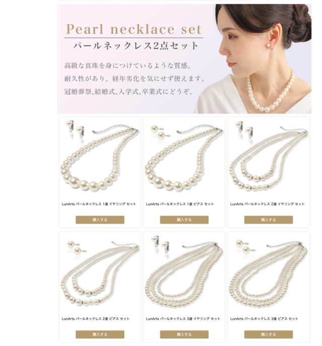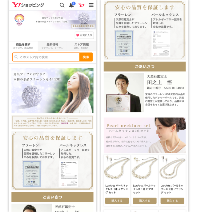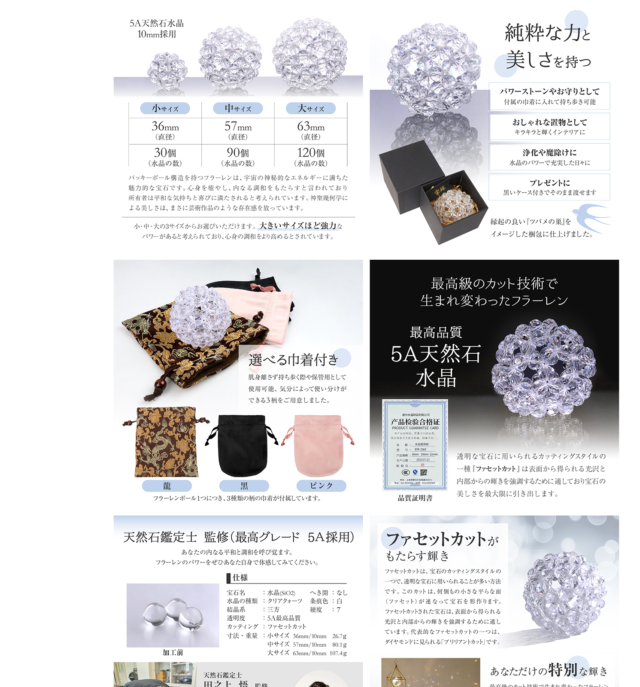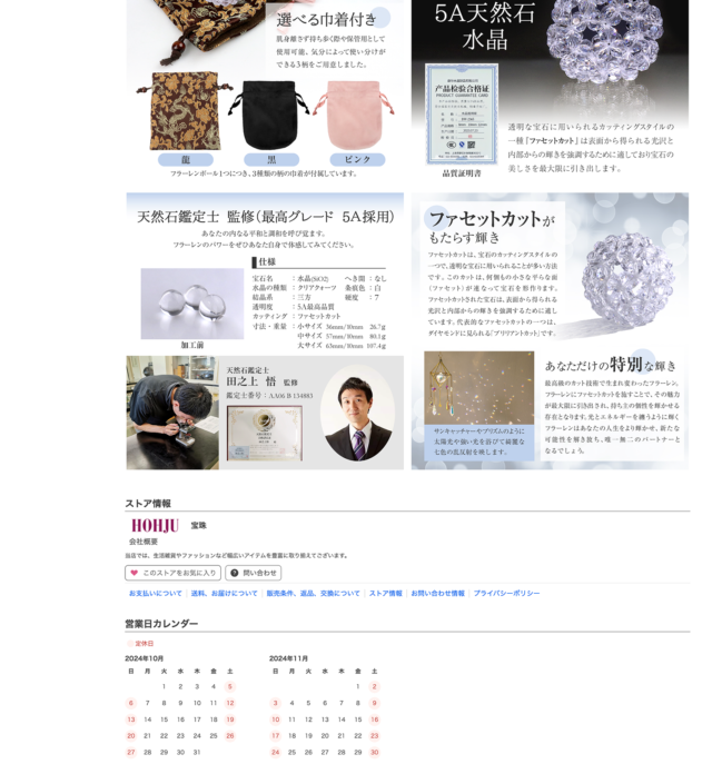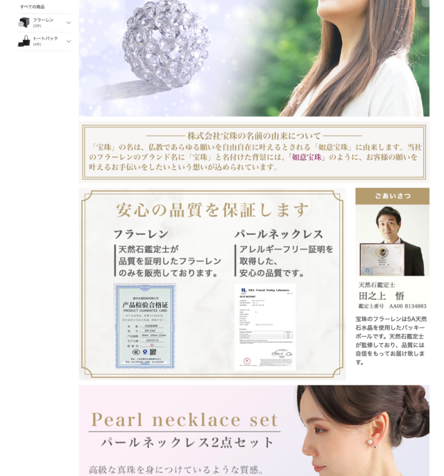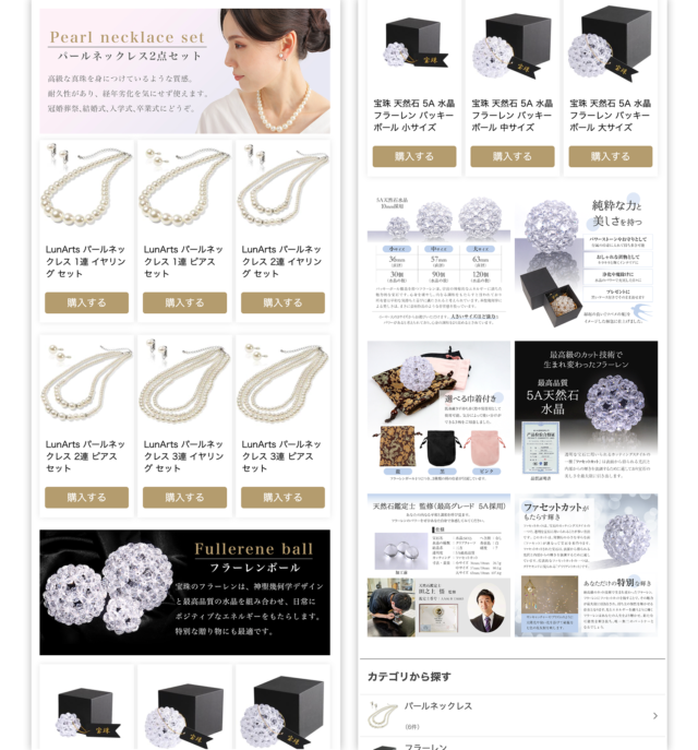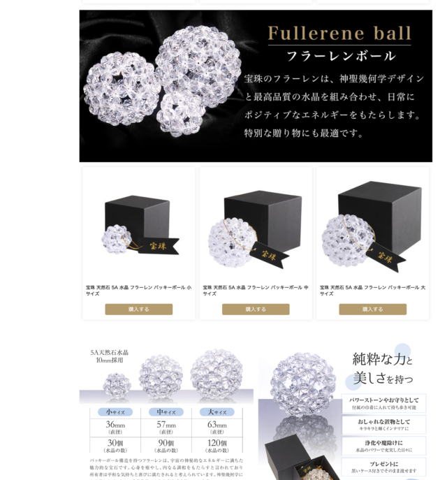 水晶フラーレンや、イミテーション真珠のネックレスを中心にを販売されている店舗様です。